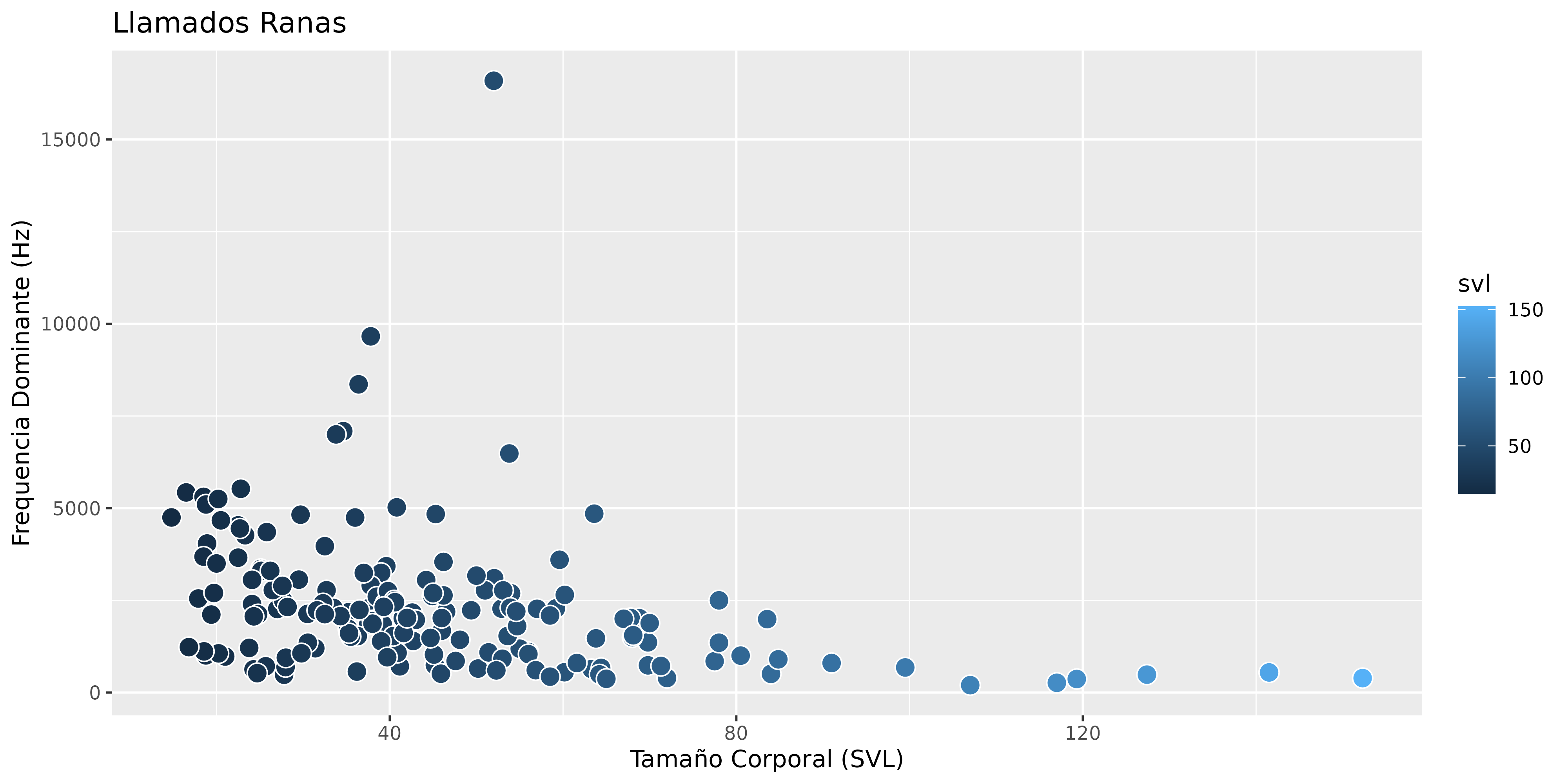 Datos sobre tamaño corporal, frecuencia dominante, y hábitat de 176 especies de ranas, tomados de Muñoz et al. (2020)