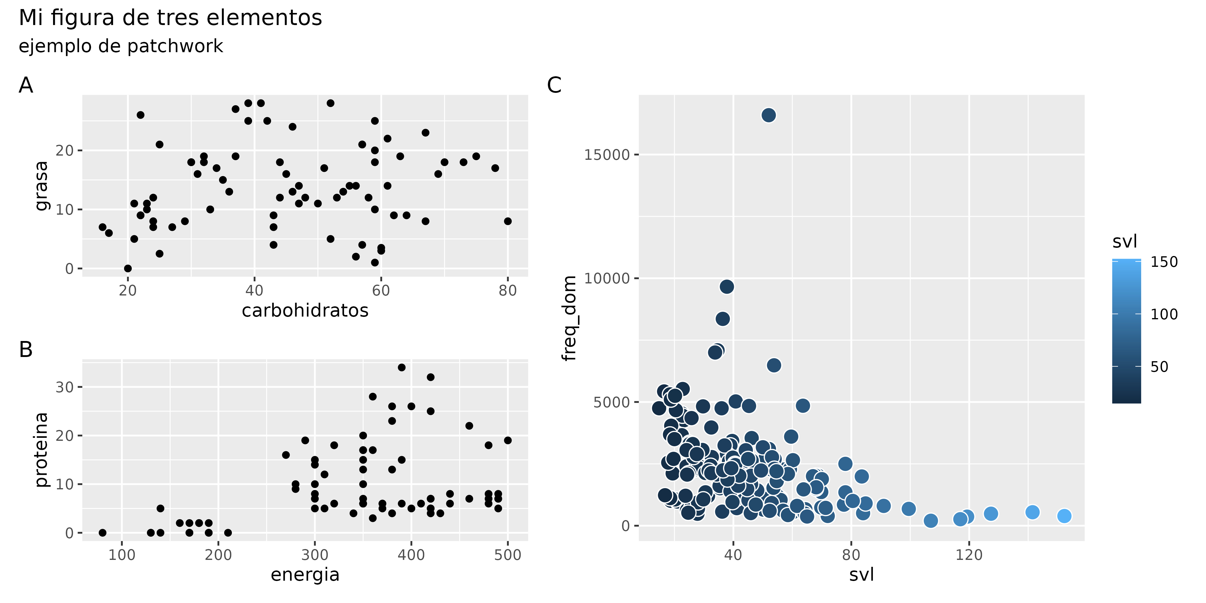 + para acomodar dos gráficos juntos| para figuras lado a lado/ para apilar figurasplot_layout() para controlar la composiciónplot_annotation() para rotular elementos o agregar textosMás fácil de leer: