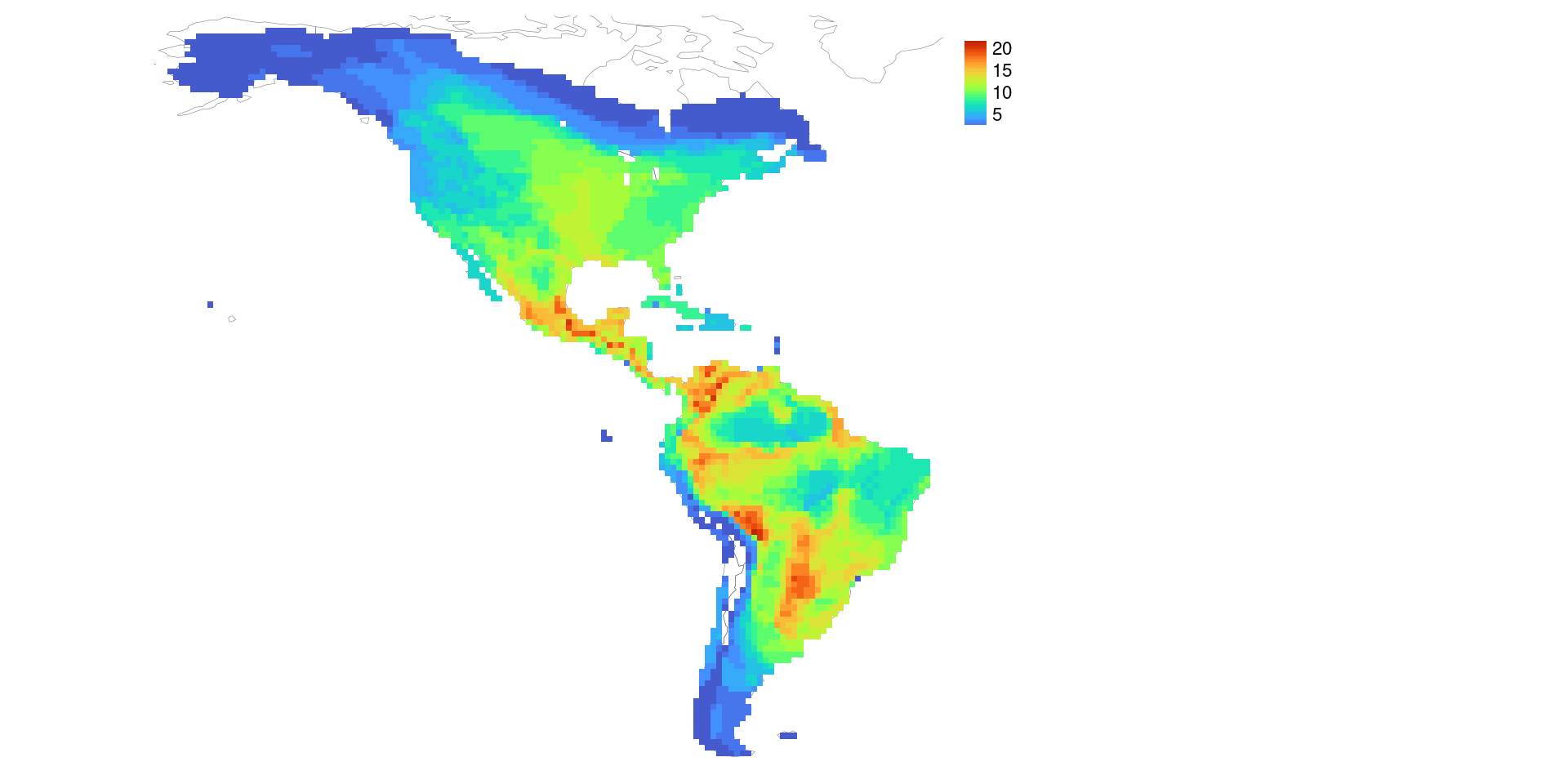 En este ejercicio veremos cómo usar las distribuciones de las especies (polígonos, como los que generamos en el ejercicio anterior) para generar el patrón geográfico de riqueza de especies