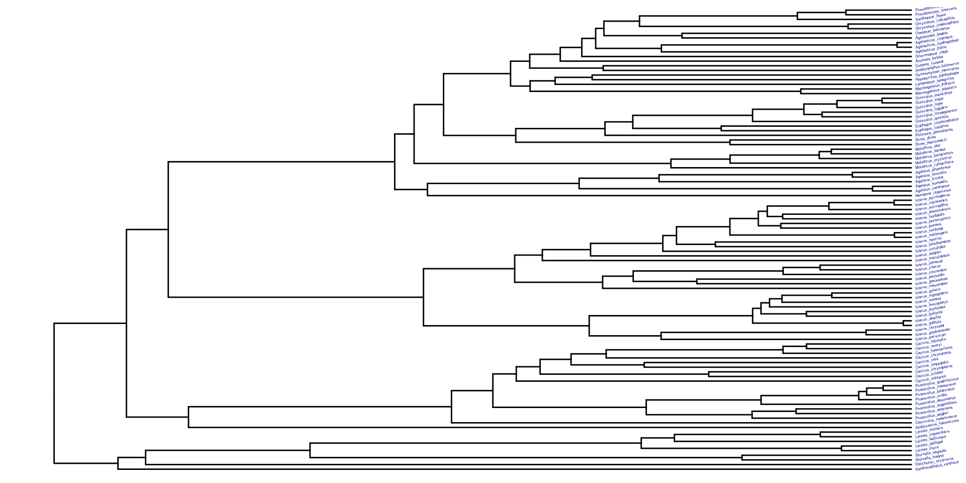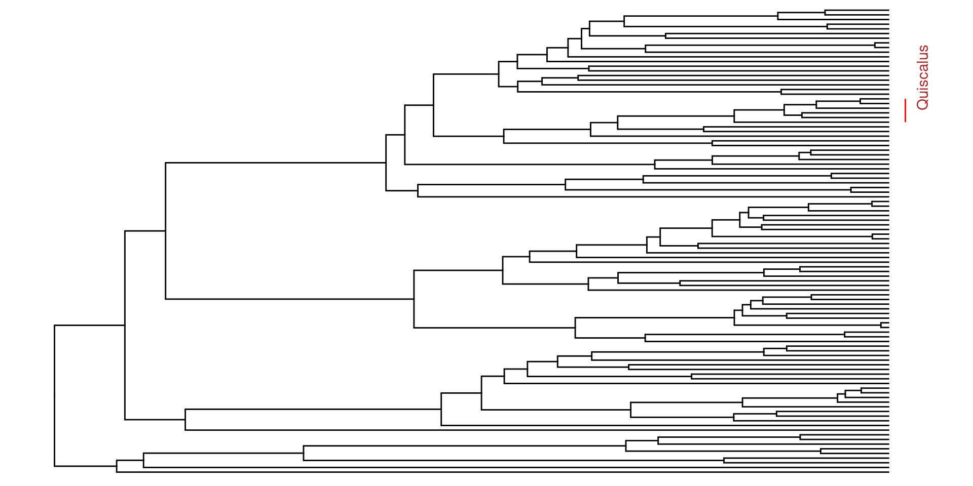 Ahora para la anotación de los árboles, se pueden hacer varias cosas, a mi, por ejemplo, me gusta mucho el género Quiscalus, y quisiera saber donde se encuentra en la filogenia.