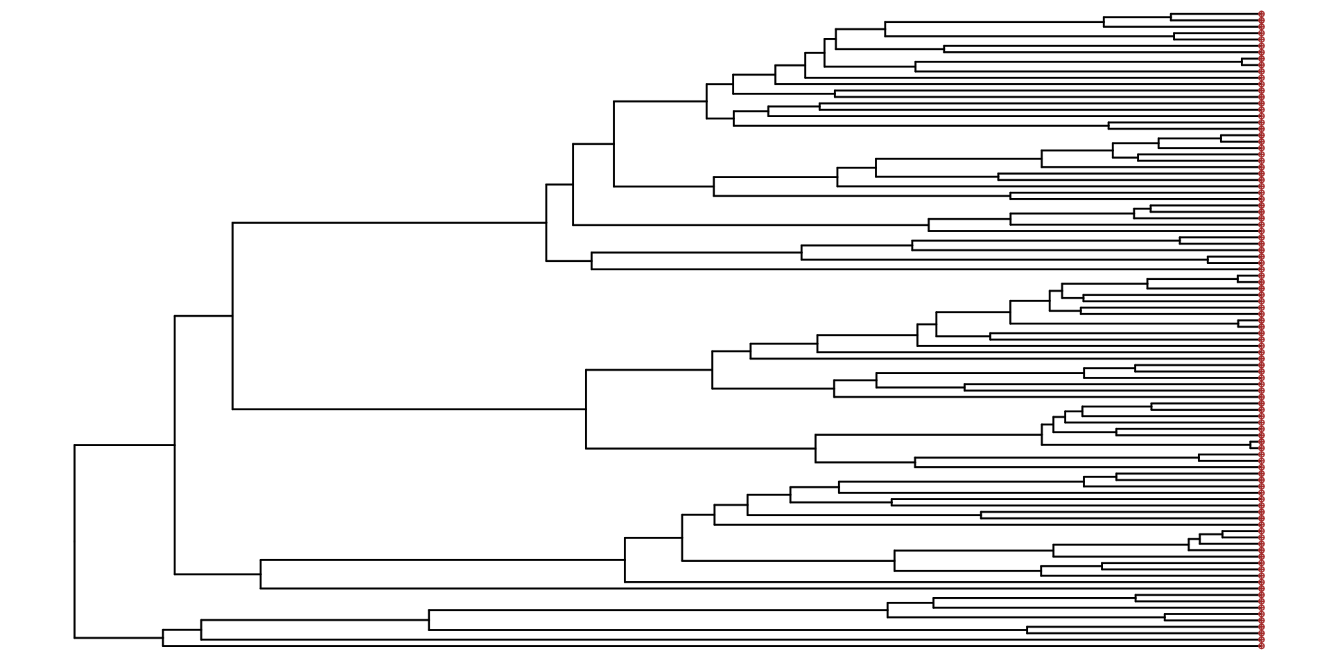 Phylogenetic tree with 100 tips and 99 internal nodes.