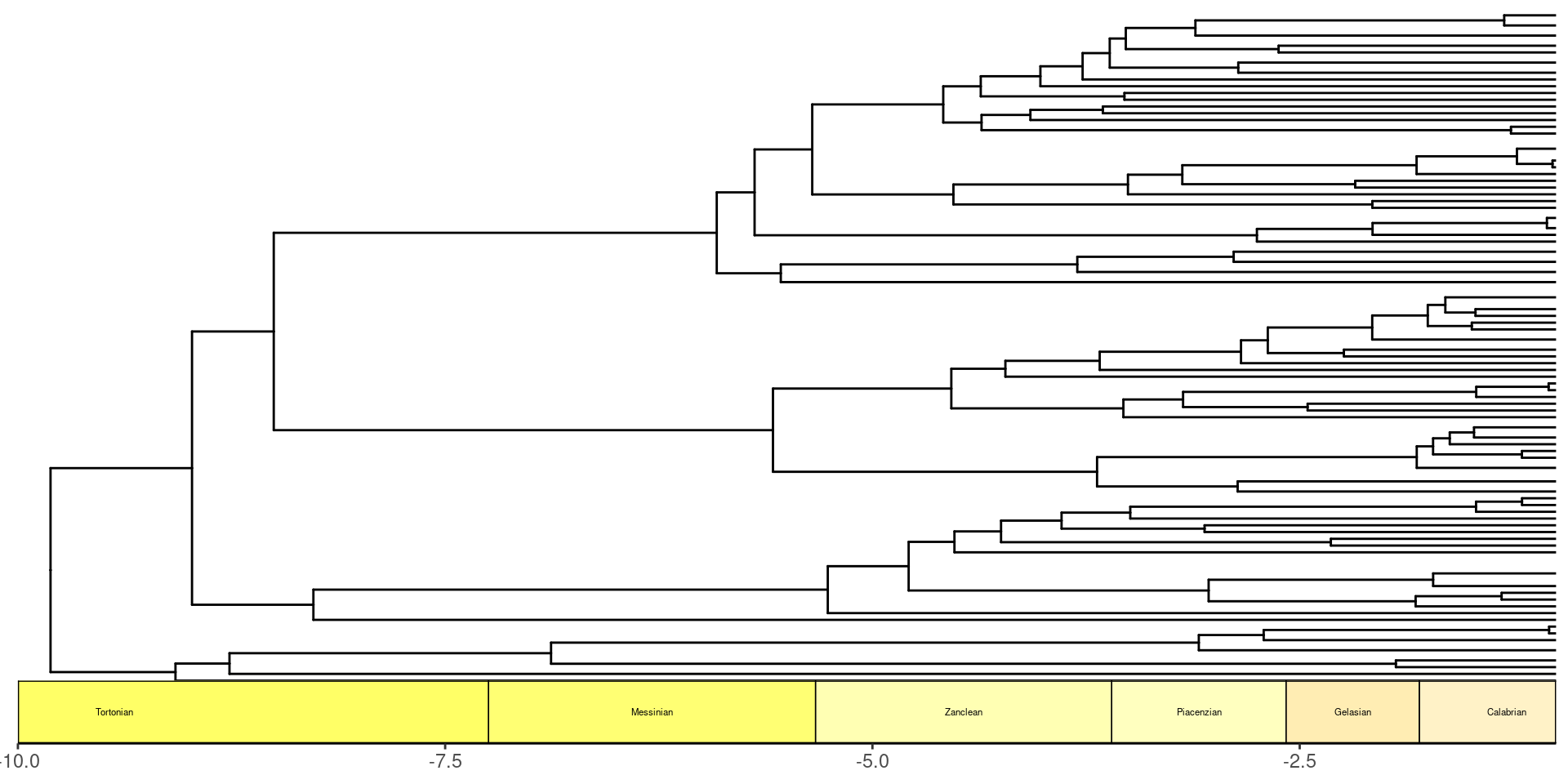 e incluso agregar una escala temporal a la filogenia, con la ayuda del paquete deeptime