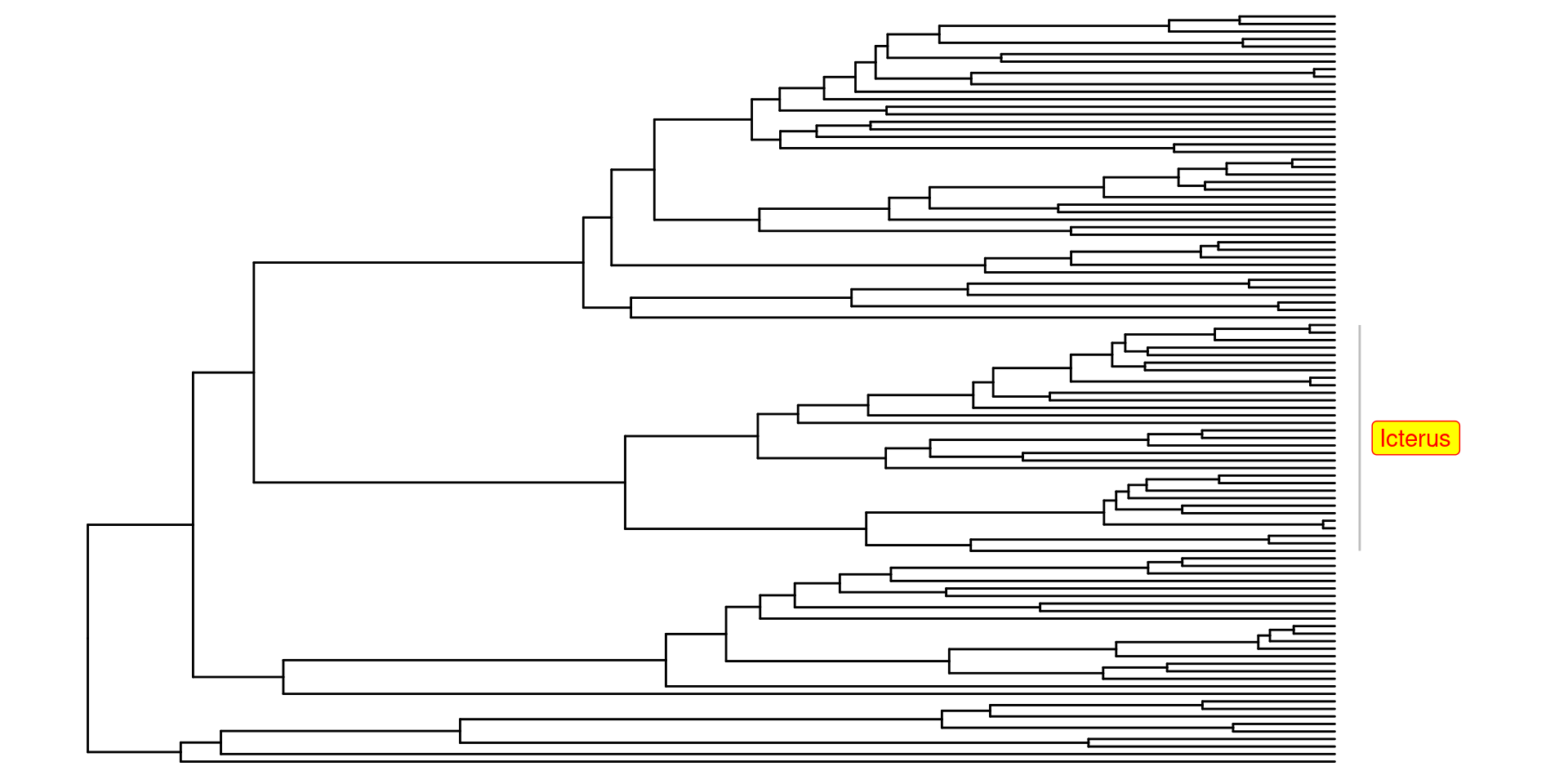 geom_cladelab(node=725,label="Icteridae",barcolor="orange",textcolor="white",offset.text=5, fontsize=4,angle=45)+