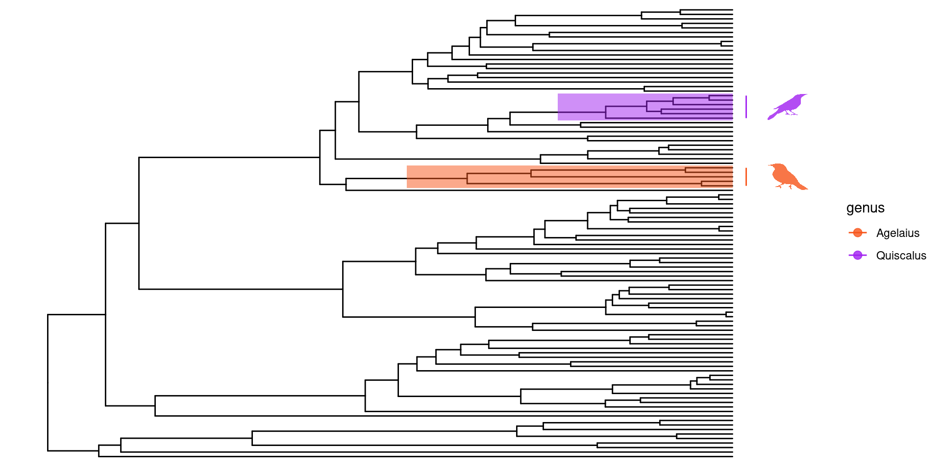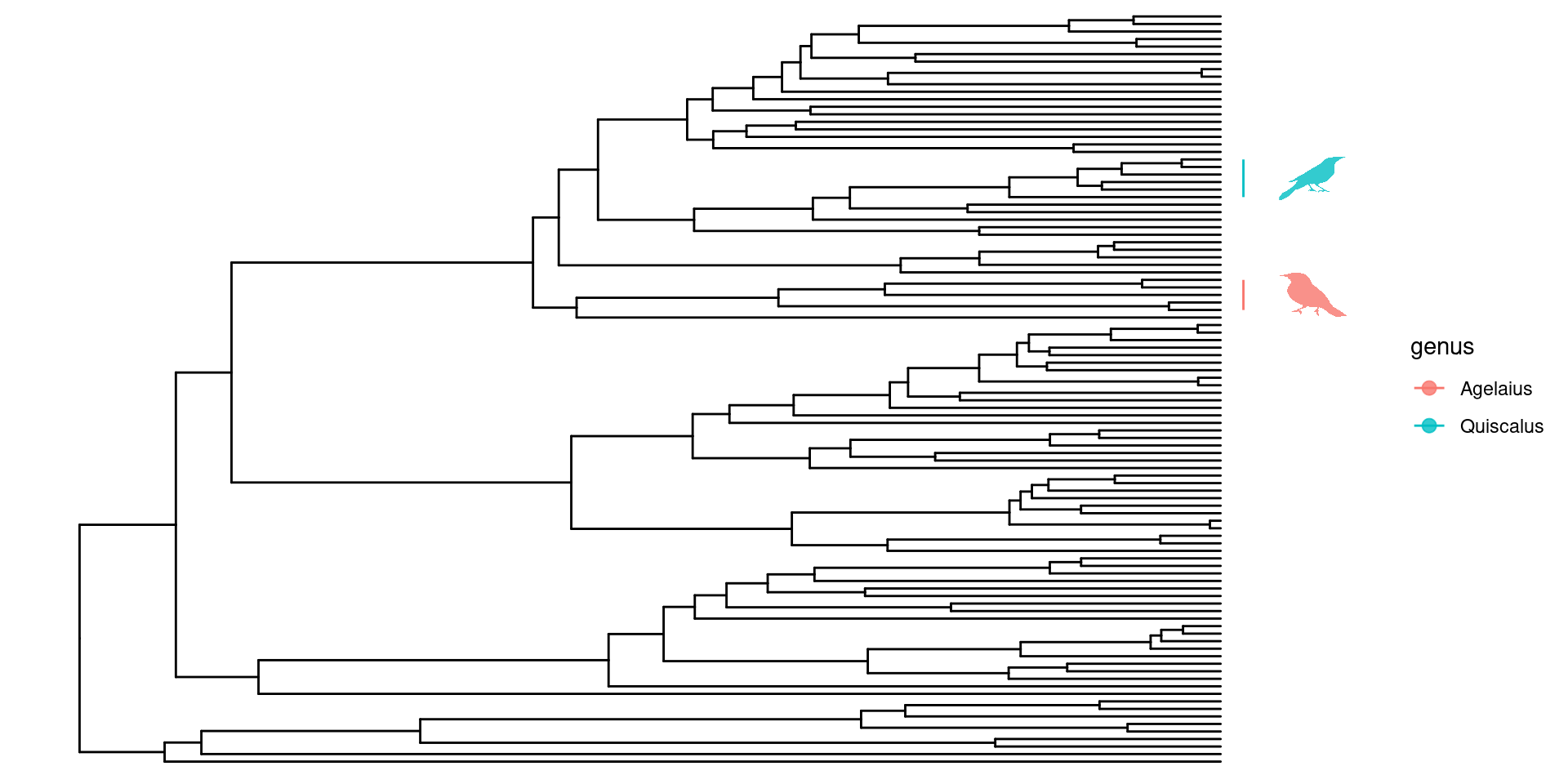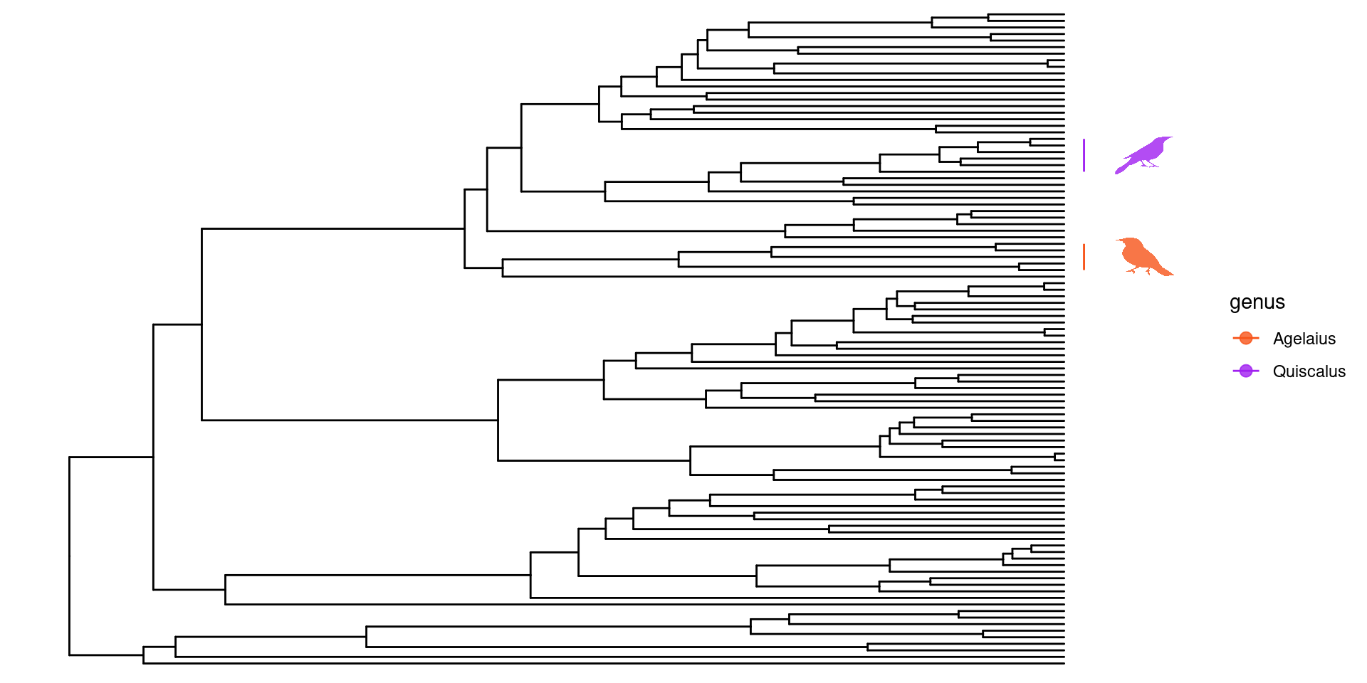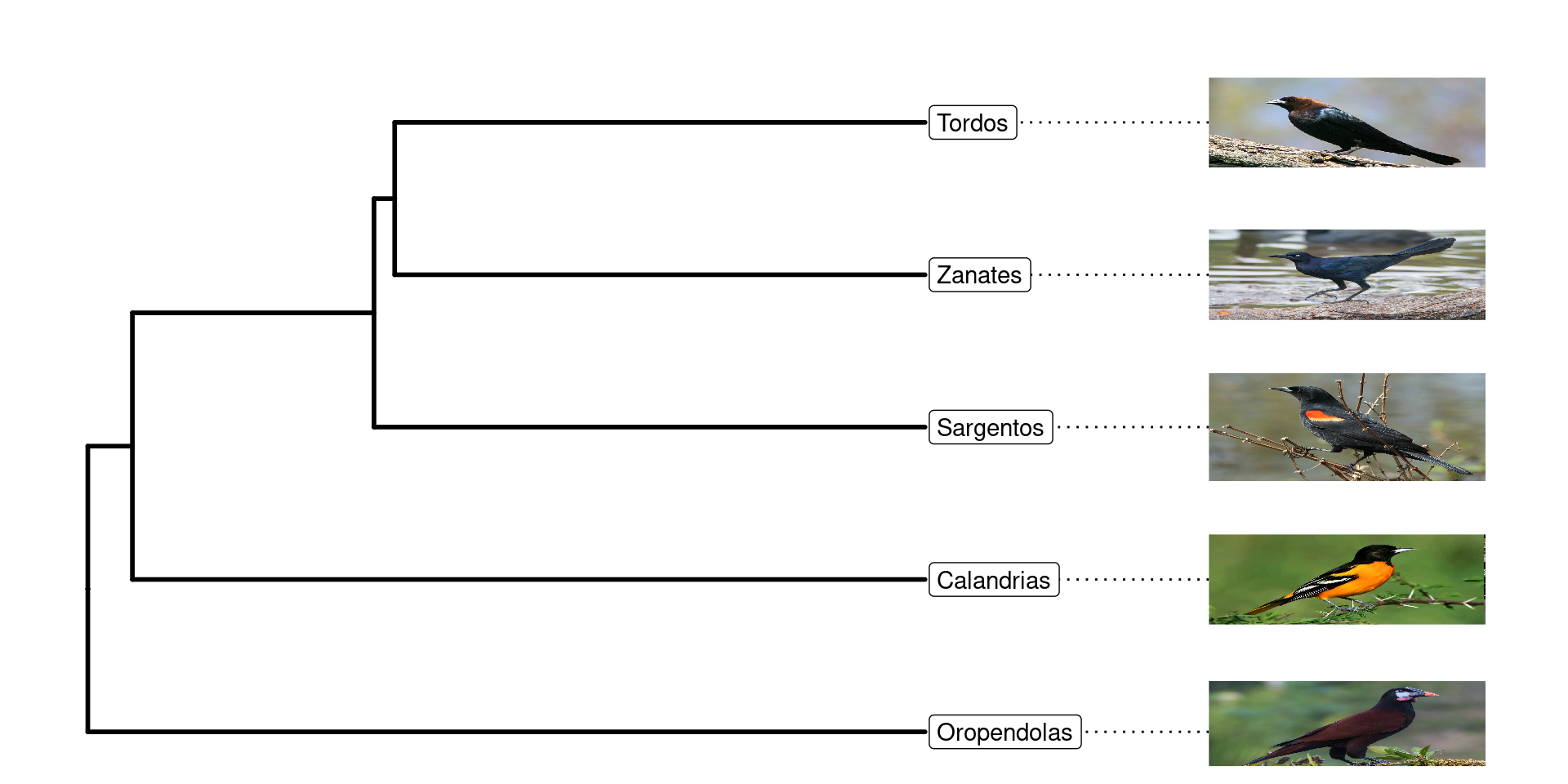 geom_cladelab(node=707,label="Calcariidae",barcolor="blue",textcolor="white",offset.text=1, fontsize=4,align=T)Para poder anotar las filogenias con imagenes, es recomendable usar árboles filogéticos pequeños, en los cuales quizá con un grupo de representantes bastaría. En este ejemplo usaremos una filogenia parafiletica con los generos Quiscalus (Los zanates), Icterus (Las calandrias), Molothrus (Los tordos), Agelaius (Los sargentos) y Psarocolius (Las oropendolas):