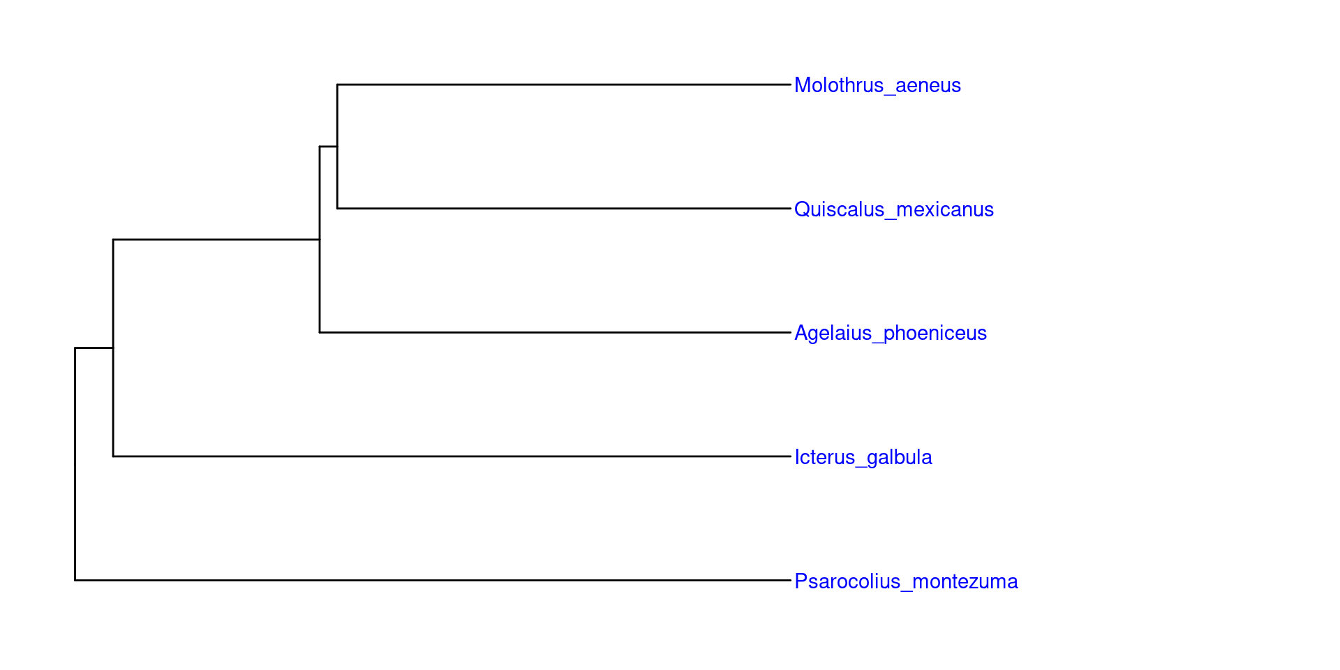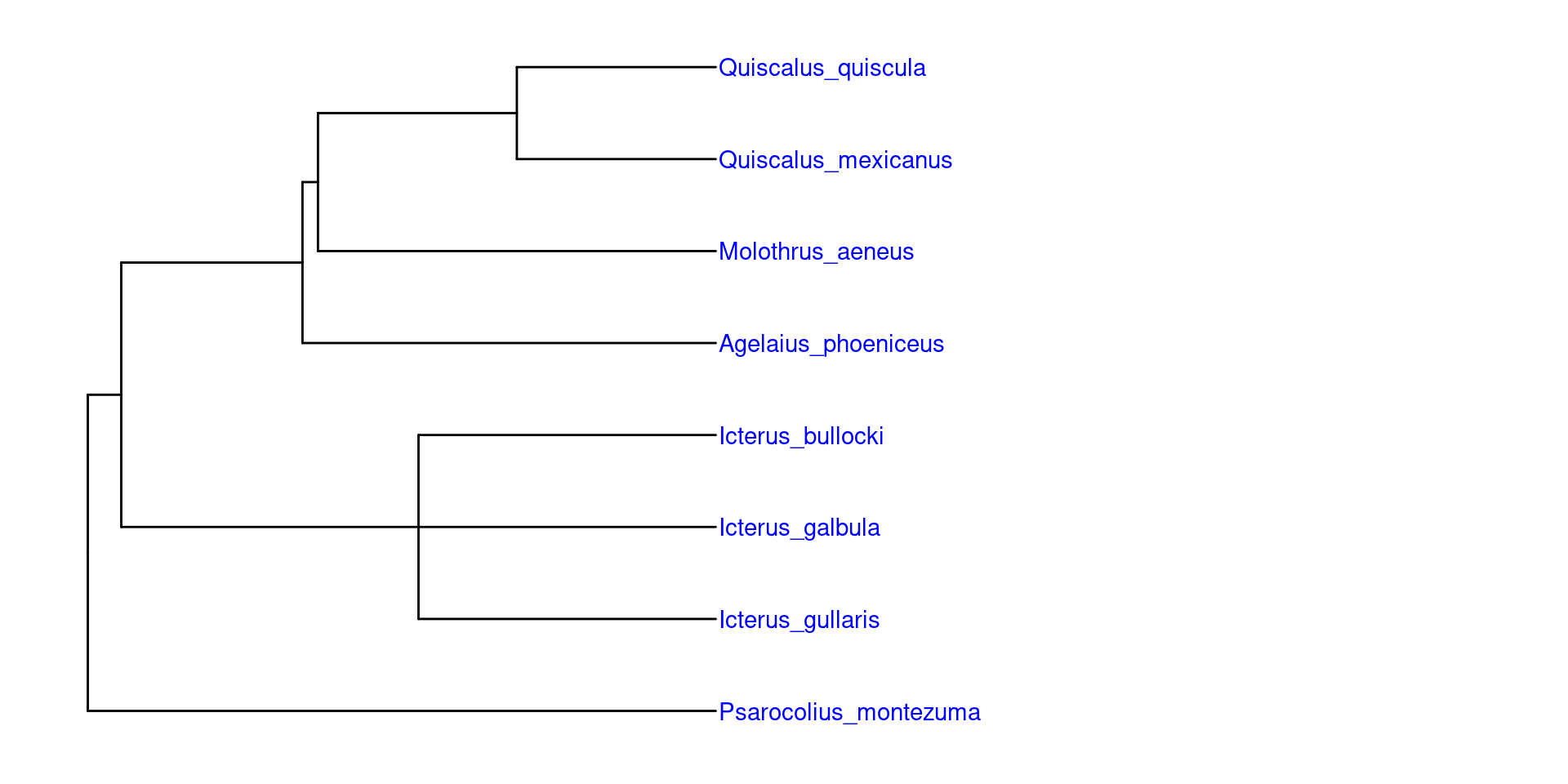 En este caso usaremos un árbol filogenético en particular (la filogenia de Icteridae). Sin embargo, estos ejemplos se pueden hacer en su mayoría con cualquier otra filogenía que tengan disponible.