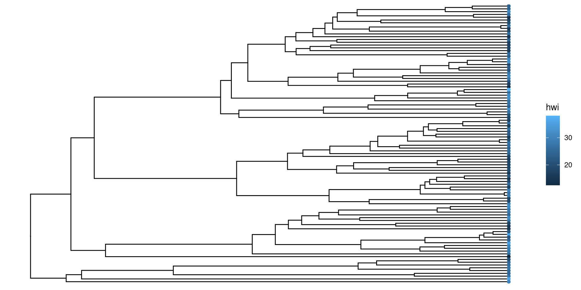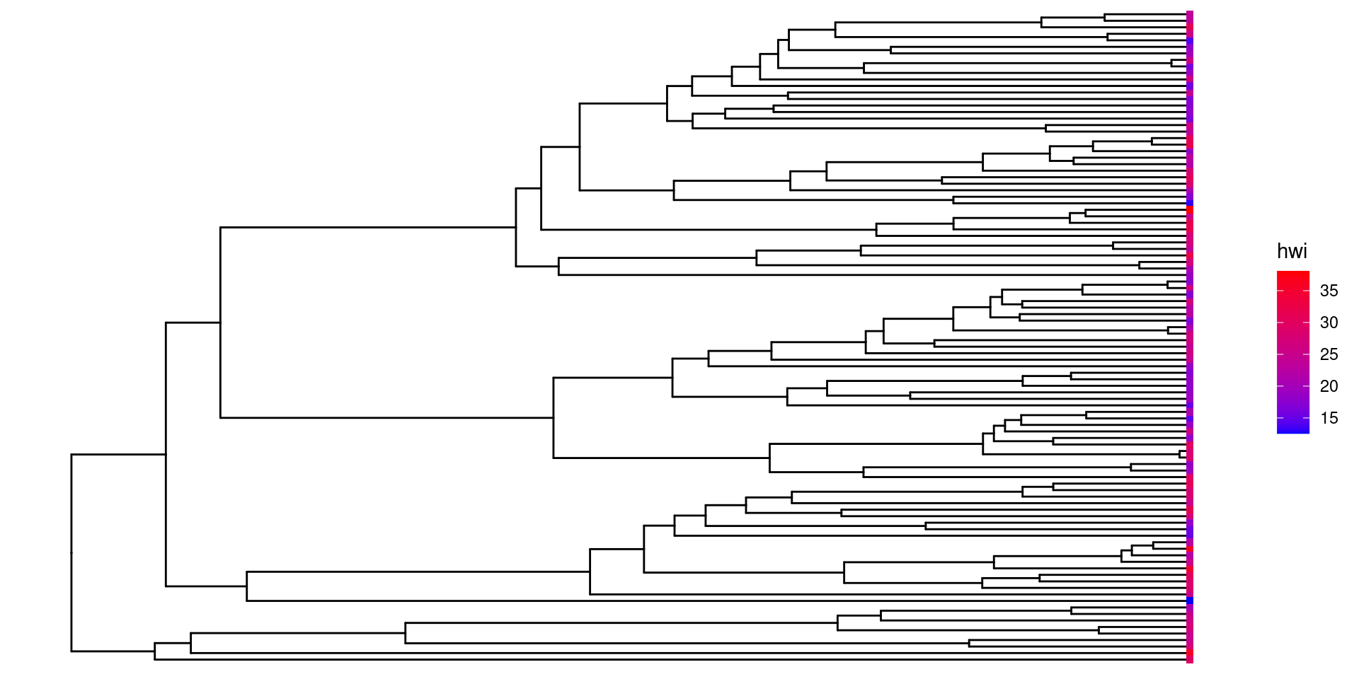 Primero gráficaremos los valores continuos del HWI sobre las puntas del árbol en una escala de colores: