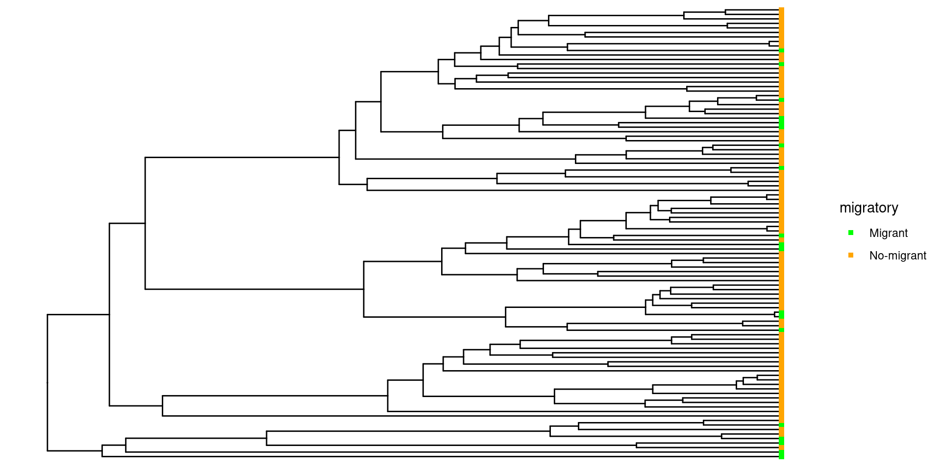 px<- py%<+% migrants + geom_tippoint(aes(color=migratory),shape=15)+