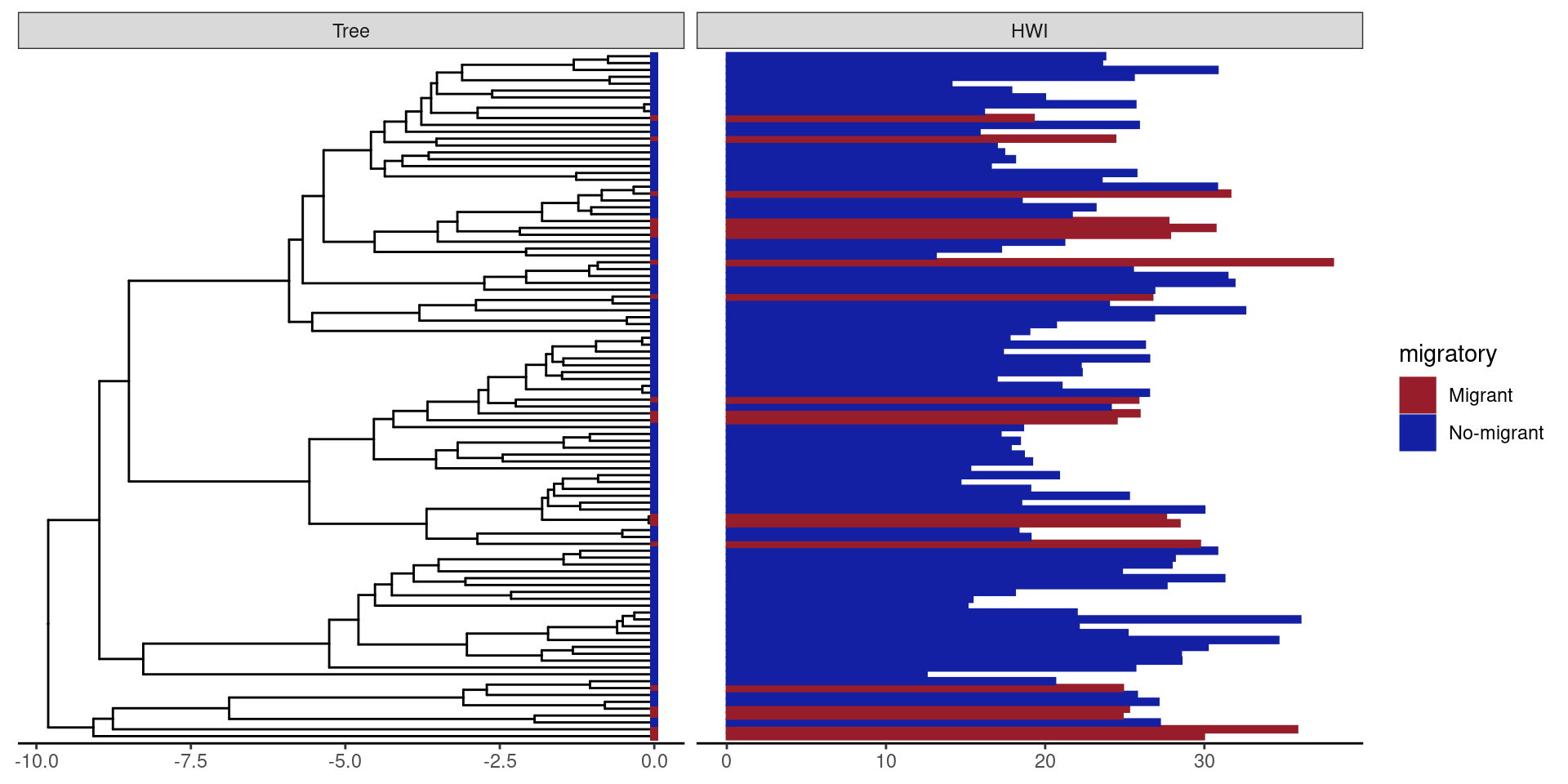 px+ geom_facet(panel="HWI",data = hwi,geom=geom_col,mapping=aes(x=hwi,color=migratory,fill=migratory),orientation='y')+